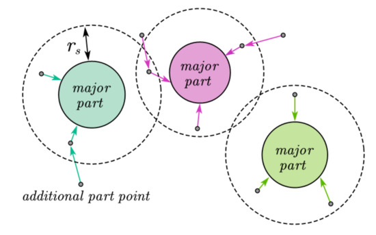 After extracting the major part of the object, the remaining points in the point cloud are single points mostly. These points belong to the additional parts of the object or the ground points. In our previous work [6], we proposed a slice-based ground point segmentation method. After removing the ground points, the points of the additional parts can determine which major part it belongs to according to the distance, as to finish the instance segmentation of a whole point cloud. Generally, for an object, the points of its additional part are scattered around its major part. Thus, we can take the major part as the center and the radius as rs to search for its additional part points from near to far. When a point is in the search range of multiple major parts, it belongs to the nearest major part. The schematic diagram of the growing points of additional parts is as shown in Figure 10.