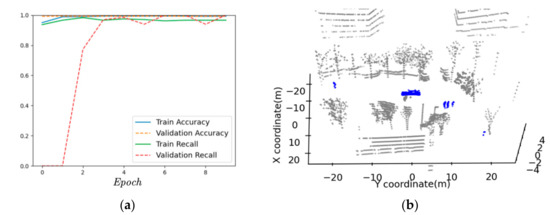 Figure 22b,c show an example of the collected point cloud and the results of instance segmentation, respectively. We counted the actual number of objects in the original point cloud and the number of objects obtained by the instance segmentation algorithm within a 30m radius, as shown in Table 5. It can be seen that some environmental objects (plants, poles, and buildings) may be segmented incorrectly. This is because vehicles will block the points in the key regions of the environment object in the case of dense traffic, resulting in missing of these objects.