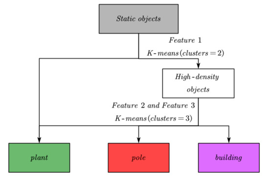 In the collected point cloud data, static objects include buildings, poles, and plants. Because we have defined the categories of static objects in advance and the characteristics between them are very clear (the three features in Section 4.2), we chose unsupervised learning to classify the static objects, which can avoid manual annotation. In Table 4, we evaluate K-means and spectral clustering by the average precision (AP) of the three objects. It can be seen that the precision of K-means is higher.