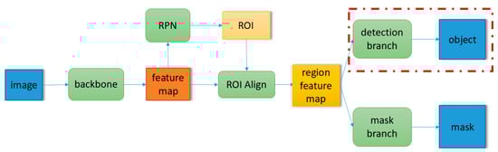 Mask R-CNN is a two-stage instance segmentation network proposed by Kaiming He in 2016. Without using any trick, Mask R-CNN achieved the best results in the 2016 Microsoft COCO object detection and instance segmentation competition. The core network architecture of Mask R-CNN is shown in Figure 1. The backbone network is responsible for generating a feature map based on the input image, and the region proposal network (RPN) generates category agnostic region of interest (RoI) based on the extracted feature map. RoI align extracts the features corresponding to RoI to get the regional feature map. These regional features will be sent to the detection branch for object classification and bounding box regression. Regional features based on the predicted region of detection branch will be sent to the mask branch for pixel level segmentation in the prediction stage.