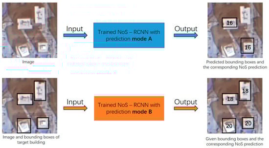 In the above network architecture, the set of building objects in the NoS estimation task is up to the result of building object detection task, which makes the application of the model have some limitations. For example, we cannot get the NoS estimation result of those objects that the model cannot detect. However, after a little modification of the above network architecture, the model can estimate NoS on the arbitrary given building object set, which makes the trained model have two prediction modes—mode A: in the prediction stage, the model inputs the monocular image, outputs the detection results of building objects and the corresponding NoS estimation results; mode B: in the prediction stage, the model inputs the monocular image and bounding box set of target buildings, outputs the given bounding boxes and the NoS estimation of the target buildings. The comparison of mode A and mode B is shown in Figure 3. Mode B expands the application scenarios of the model. The network architecture of mode B is shown in Figure 4. The input of RoI align is replaced the prediction of RPN with the given building bounding boxes. The “NoS head” shown in Figure 4 refers to the detection branch shown in Figure 2. In the detection branch, the prediction of the object detection task is replaced with the given building bounding boxes, and the corresponding NoS prediction is retained.