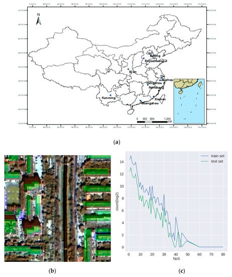 Data set. (a) The geographical distribution of samples in the data set. (b) The sample image and ground truth. The green labels in (b) are the building mask ground truth used in mask branch training, the bounding boxes are the bounding box ground truth, and the number on bounding boxes are NoS ground truth. (c) The distribution of the number of buildings with different NoS, whose vertical axis carried out logarithm transformation based on 2.