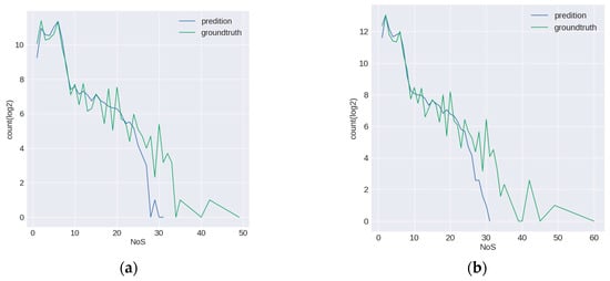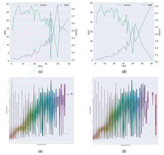 Distribution of evaluation metrics on different NoS. The left and right columns are the results of mode A and mode B, respectively. The first row, i.e., subfigures (a,b), reflects the quantitative distribution of predicted value and true value on different NoS, and on its vertical axis logarithm transformation was carried out based on 2; the second row, i.e., subfigures (c,d), reflects the distribution of MAE and nosIoU on different NoS; the third row, i.e., subfigures (e,f), is the violin diagram of predicted value of NoS, reflecting the distribution of predicted values on different NoS.