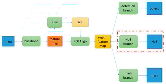 In order to achieve the objectives of this study, in addition to the integration mode described in Section 2 (i.e., “detection branch integration”), another natural and direct mode of integration is to add a separate branch for the NoS estimation task, as shown in the red dashed-line frame part in Figure 8, which is parallel to the detection branch and called “NoS branch”. NoS branch is trained and inferred in a manner consistent with the mask branch []. In this article, we call this method of integrating NoS estimation tasks by adding new branches paralleled to detection branches as “NoS branch integration”. To compare the performance differences between different integration modes and to explore the interaction between detection tasks and NoS estimation tasks in this multitask learning architecture, we conducted three supplementary experiments to compare the results from the “detection branch integration” experiment in Section 3, which was set up as follows: