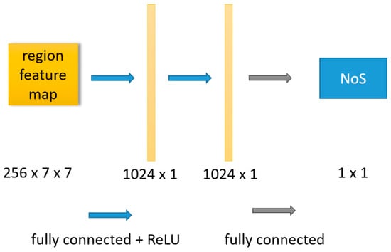 - NoS branch. Using the architecture shown in Figure 8 and Figure 9. In order to maintain the comparability between experiments, the specific network architecture of NoS branch which is shown in Figure 9 remains similar to detection branch which is shown in Figure 2 in “detection branch integration”. In prediction stage with mode B, “NoS head” in Figure 4 is NoS branch. The loss function of the network is consistent with that in “detection branch integration”.