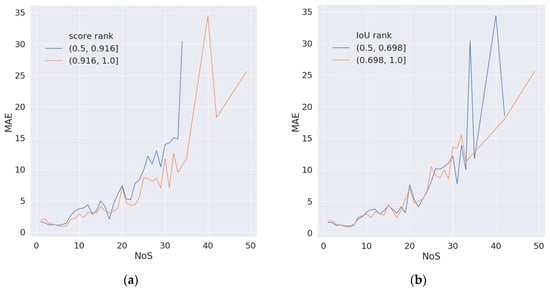 It can be seen that for score, the MAE distribution curve of the subset with high score is under the subset with low score in most of the horizontal axis, which indicates that the prediction result of high score on the TP sample is often relatively low, that is, it has higher accuracy in the NoS estimation task. For IoU, the curves of the two subsets are intertwined in most of the horizontal axis, and there is no obvious advantage of a subset. Therefore, there is no clear relationship between the location accuracy of detection task and the accuracy of NoS estimation on TP samples.