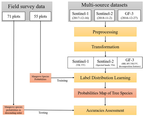 Figure 2 shows the main steps of remote-sensing image processing and the mangrove species mapping using the LDL. First, the preprocessing steps were applied to Sentinel-1, Sentinel-2 and GF-3 datasets. Furthermore, data transformation was applied to Sentinel-2 and GF-3 datasets to obtain vegetation indices and decomposition features. The probabilities derived from 55 sample sites were used to train the LDL. Then, the probabilities map of tree species in the study area were generated. Finally, we used the descending probabilities from 71 sample sites to perform the accuracy assessment.