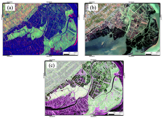 (a) False composite color image of Sentinel-1 (R:VH, G:VV, B:VV) acquired on 16 December 2017, (b) True composite color image of Sentinel-2 (R: Band 4, G: Band 3, B: Band 2) acquired on 2 November 2018. (c) False composite color image of GF-3 (R:HH, G:HV, B:VV) acquired on 27 December 2016. The land cover types surrounding the mangroves contain sea water, agriculture, tidal mudflat, salt field, built-up areas etc [41].