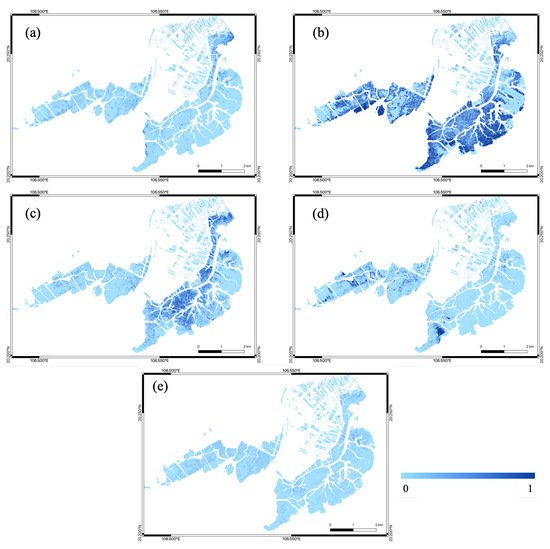 Probability maps of (a) Sonneratia caseolaris (SC), (b) Kandelia obovata (KO), (c) Aegiceras corniculatum (AC), (d) Rhizophora stylosa (RS), (e) Avicennia marina (AM) generated by the best performance (OA: 62.44%, AA: 51.90%) using the specialized algorithm with BFGS optimization (SA-BFGS) and the combination of spectral bands, vegetation indices of Sentinel-2, and four polarization channels of Gaofen-3, which is short for S2+VIs+GF(4) in the manuscript.