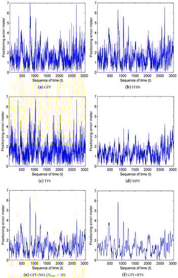 The smoothness of the estimated trajectory over time is depicted in Figure 8. Figure 8a displays that the estimation error of GPF fluctuates sharply indicating a higher estimation noise. The FFBS (Figure 8b) and TFS (Figure 8c) obtain almost the same instability as GPF. The MPS (Figure 8d) removes the extremely large positioning errors, whereas, it keeps the fluctuation of the small errors. The GPF+MA (Figure 8e) and GPF+RTS (Figure 8f) obviously remove the high-frequency errors, however, the very large positioning errors (the low-frequency errors) are not smoothed. Thus, the linear smoothers with a nonlinear filter are more a sense to smooth the representation of the position estimation. Over the whole moving trajectory, MPS observes the best smoothness, which removes the large positioning errors for nonlinear and non-Gaussian errors (NLOS errors). By validation in the real-world indoor tracking experiment, we summarize that