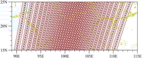 Spatial distribution of the observational position of the AMSU-A (black circles) and MHS (red dots) onboard the NOAA-19 satellite over southeast Asia at 0000 UTC 9 August 2019.