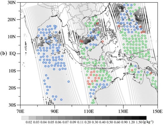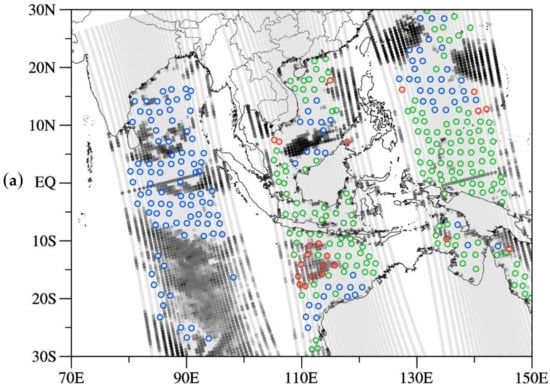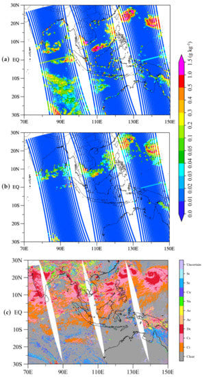 Figure 2 shows the spatial distribution of the LWP (Figure 2a) and IWP (Figure 2b) retrieved from the AMSU-A and MHS observations obtained by the MetOp-A satellite over southeast Asia during the time period 0900–1500 UTC 8 August 2019. Figure 2c shows the spatial distribution of the MODIS cloud classification products over southeast Asia between 0300 and 0900 UTC 8 August 2019. The MODIS cloud classification product was obtained by combining the cloud optical thickness and the cloud-top pressure in the MOD06_L2 product [42,43] Q. The most notable feature in Figure 2c is the large areas of cloud caused by two simultaneous typhoons, Lekima and Rosa, over the ocean to the east of China. Although there is a time lag between the two sets of data, it is clear from Figure 2 that the LWP accurately identifies the cloudy areas over the ocean, with the large value area of the LWP in the western Pacific Ocean corresponding to the deep convective spiral cloud masses of the typhoon and the convective cloud masses on the western side of the Philippines. The banded large LWP region in the northern Indian Ocean corresponds to deep convective and cirrocumulus clouds over the ocean. The extensive area covered by the large LWP in the southern Indian Ocean corresponds to cumulus and cirrus clouds over the ocean. The IWP is good at identifying deep convective and cirrus clouds over the ocean, especially the cirrus clouds missed by the LWP, such as those around the typhoons and banded convective cloud systems in the upper right corner of the region. More accurate cloud detection results can therefore be obtained by combining the two streams of data.
