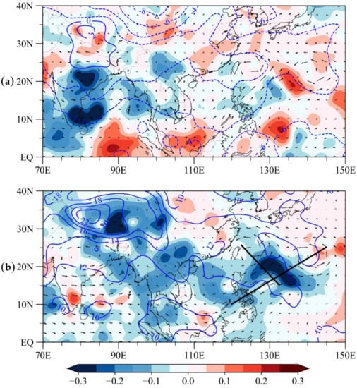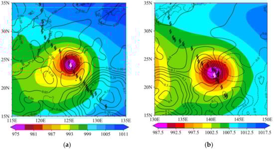 Figure 7a,b show the spatial distribution of differences in the SLP forecast between the ODS and CTRL experiments at the three- and 57-h forecasts, respectively. The difference is not significant for the three-hour forecast. However, the low center of the SLP (solid contours) in the ODS experiment is clearly further north than that in the CTRL experiment (dashed contours) for the 57-h forecast and is also closer to the observed center of the typhoon. This indicates that the lower air temperature and higher pressure to the southeast of the typhoon led to an increase in the speed of movement of the typhoon in the ODS forecast.