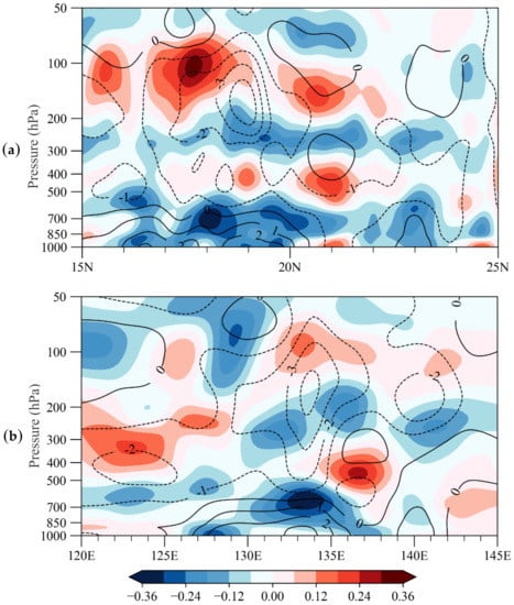 Figure 5 presents cross-sections of the differences in the air temperature and geopotential height analyses between the two experiments (ODS–CTRL) at 0900 h UTC on 8 August 2019 to further clarify the impact of the increased assimilation of observations on the air temperature analysis. The location of the cross-sections is shown by the black line in Figure 4b, with the southeast-northwest line corresponding to the (a) and the southwest-northeast line corresponding to the (b). The temperature differences show a vertical distribution between the positive and negative phases; both cross-sections have negative temperature differences below 500 hPa, with a large value center located near 700 hPa. This means that the negative differences in the air temperature analysis are probably caused by the assimilation of the extra observations from AMSU-A channel 5, the peak weighting function of which is around 700 hPa. The differences in geopotential height of these two cross-sections show a good consistency. For the atmosphere below 700 hPa, the geopotential height in the ODS experiment is increased in the areas corresponding to the negative temperature differences at this height, but for the upper atmosphere above 700 hPa, the geopotential height is decreased obviously, the negative differences are up to −4 gpm, with the center mainly located at 200 hPa.