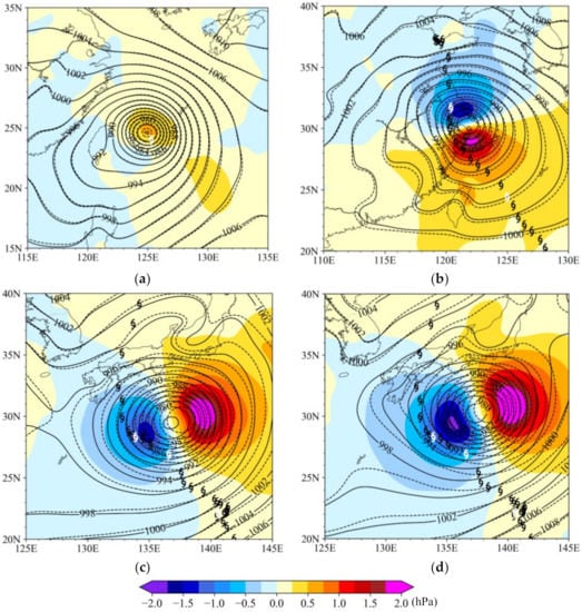 Spatial distribution of the forecasted SLP of ODS (solid contours at 2-hPa interval) and CTRL (dashed contours at 2-hPa interval) and their differences (ODS-CTRL, shaded) at (a) 1200 UTC 8 August 2019 (3-h forecast), (b) 1800 UTC 10 August 2019 (57-h forecast), (c) 1800 UTC 12 August 2019 (105-h forecast) and (d) 1200 UTC 13 August 2019 (123-h forecast). The locations of the observed centers of (a,b) Lekima and (c,d) Rosa are indicated by typhoon markers; the white typhoon markers represent the central positions at that particular time.