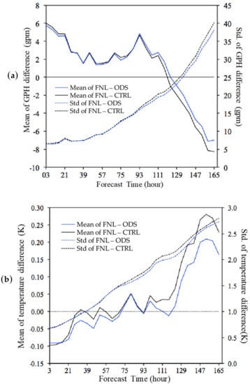 Forecasts of the geopotential height at 500 hPa were further evaluated by comparison with the final analysis (FNL) data [46]. Figure 8 shows the mean bias (solid curves) and standard deviation (dashed curves) of the difference between the forecasts and the FNL data (FNL−CTRL, FNL−ODS) with the forecast time for the geopotential height at 500 hPa and the air temperature at 300 hPa. The blue curves represent the difference between the ODS and the FNL data (FNL−ODS), whereas the black curves represent the differences between the CTRL forecast and the FNL data (FNL−CRL). Figure 8a shows that with an increase in the forecast time, the mean bias remained slightly positive (about 2 gpm) for the first 110 h, but then quickly shifted to a negative bias as high as −8 gpm, while the standard deviation gradually increased. The mean bias and the standard deviation of the two experiments were similar in the first 110 h, after which the bias and standard deviation of the ODS experiment were stable, but smaller, than in the CTRL experiment.