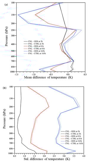 (a) Mean biases and (b) standard deviations of the vertical differences of temperature between the FNL and forecast data (FNL−ODS, solid lines; FNL-CTRL, dashed) at 3 (black lines), 81 (red lines) and 165 (blue lines) different forecast times in the region (20–60°N, 0–360°E).