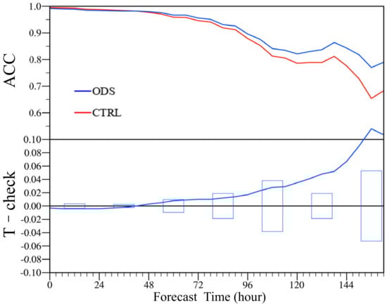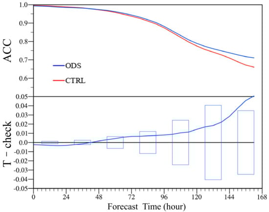 The ACC of the geopotential height at 500 hPa in the northern hemisphere between the FNL data and the forecasts of the two experiments (blue curve is for ODS experiment, red curve is for the CTRL) from 0900 UTC 8 August to 0900 UTC 9 August 2019. The blue curve is the ACC difference between ODS and CTRL (ODS–CTRL), the blue histograms represent the 95% confidence levels.