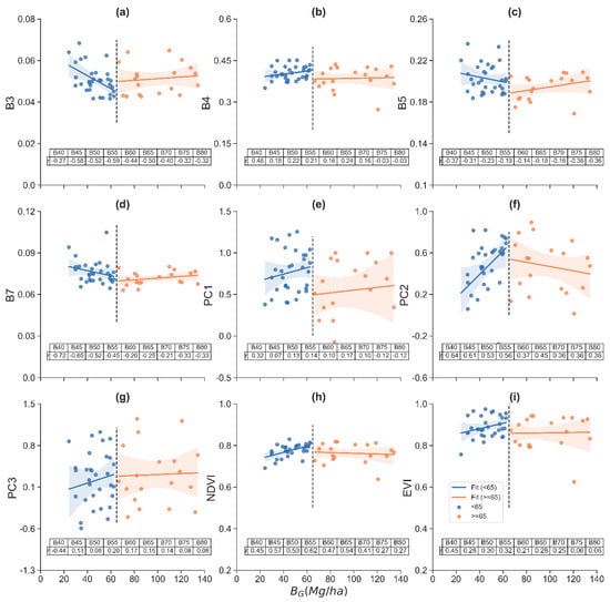 Scatter plots and correlation analysis of the biomass of rubber plantations and variables of (a) B3, (b) B4, (c) B5, (d) B7, (e) PC1, (f) PC2, (g) PC3, (h) the Normalized Difference Vegetation Index (NDVI), and (i) the Enhanced Vegetation Index (EVI): correlation coefficients were calculated with samples of different biomass sizes, starting at a biomass of less than 40 Mg/ha, with steps of 5 Mg/ha, and ending at 80 Mg/ha. The shadows in (a–i) are the 95% confidence interval.