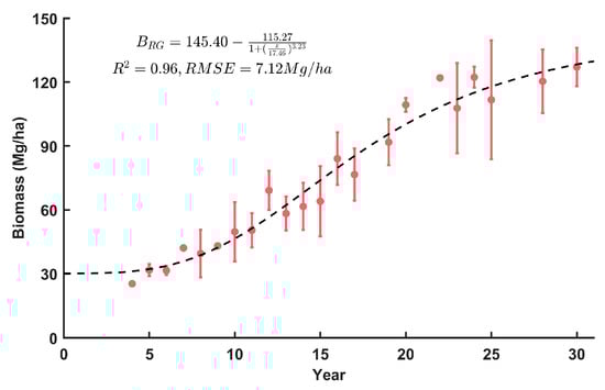 A nonlinear symmetrical sigmoidal model, named the four parameter logistic (4PL) regression model, was used to establish a regression model between the biomass of rubber plantations and stand age (Equation (5), 95% confidence) (Figure 3):