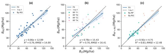 Since the RF models have a higher prediction accuracy for plantations with a lower biomass (Figure 5) and the regression model presents a high accuracy for plantations with a higher biomass (Figure 4a), a hybrid model integrating the optimal results of these two models can better predict the accuracy. The scatter plot of against results obtained from the hybrid model (BRG + RF) is shown in Figure 4c. The prediction results are more closely distributed around the 1-to-1 line. The slope of the fit line, R2, and RMSE are 0.92, 0.83, and 12.48 Mg/ha, respectively.