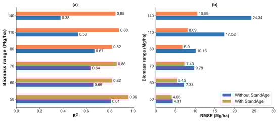 The determination of coefficients (R2) (a) and Root Mean Square Error (RMSE) (b) of the best RF models trained with samples of different biomass groups (e.g., 60 means samples with a biomass ≤ 65 Mg/ha): R2 and RMSE are the best validated from one of the four folds.