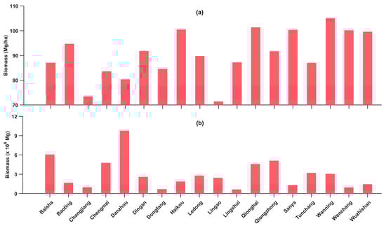 The average biomass of rubber plantations varies in different counties or cities (Figure 7a). Wanning city possesses an average biomass of about 105 Mg/ha and tops the rankings, followed by the cities of Qionghai, Haikou, Wenchang, Sanya, and Wuzhishan, all of which have an average biomass of about 100 Mg/ha. Baoting county has an average biomass of about 95 Mg/ha, followed by the counties of Dingan, Qiongzhong, and Ledong, possessing an average biomass that is slightly greater than 90 Mg/ha. The average biomass of Danzhou city, representing the largest production base on Hainan Island, is about 80 Mg/ha. Changjiang and Lingao county exhibit the lowest values among the 18 counties or cities, displaying an average biomass of about 72 Mg/ha.
