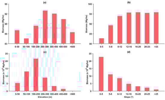 Average and total biomass of rubber plantations on Hainan Island in different regions: (a) average biomass over elevation, (b) average biomass over slope, (c) total biomass over elevation, and (d) total biomass over slope.
