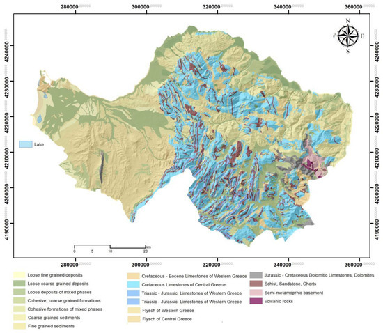 The climate of the area is characterized by a Mediterranean type, having warm, dry summers and mild, wet winters. The wet season expands from October to May. The total rainfall accounts for 93% of the annual rainfall. The wettest month is December, in which the mean rainfall is 128.9 mm, followed by November (124.7 mm). August is the driest month with a mean rainfall of 7.0 mm, followed by July (8.8 mm). Concerning the highest mean annual temperature, it corresponds to 24.3 °C, whereas the lowest value corresponds to 8.0 °C. The mean annual temperature reaches 13.7 °C [58]. Concerning the geological structure and the geotectonic settings of the study area, it is characterized by the presence of three geotectonic zones (Ionian, Olonos-Pindos and Gavrovo-Tripolis) and dominant tectonic fracturing that is responsible for the occurrence of Plio-Pleistocene sediments [59]. Specifically, within the study area, the following geological units are identified: fine-grained to coarse-grained loose Quaternary formations, coarse-grained coherent Quaternary formations, fine-grained to coarse-grained Plio-Pleistocene sediments, flysch formations, Cretaceous, Triassic, and Jurassic limestones, dolomites, schist-chert formations, sandstones, semi-metamophic, and formations of volcanic origin [60,61] (Figure 2).