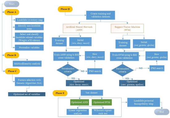 The proposed methodology follows a five-phase procedure, which involves (i) data processing, (ii) multi-collinearity analysis, (iii) feature selection, (iv) optimizing the SVM and ANN models, (v) constructing the landslide susceptibility map, testing, and comparing (linear regression analysis) the two models. For the implementation of the evolutionary algorithms and ML models, the “caret” R package [62] was used, whereas ArcGIS 10.3.1 [63] was used for accessing the spatial data and constructing the landslide susceptibility maps. Figure 3 illustrates the five-phase methodology, whereas a brief description of each phase is introduced in the following paragraphs.