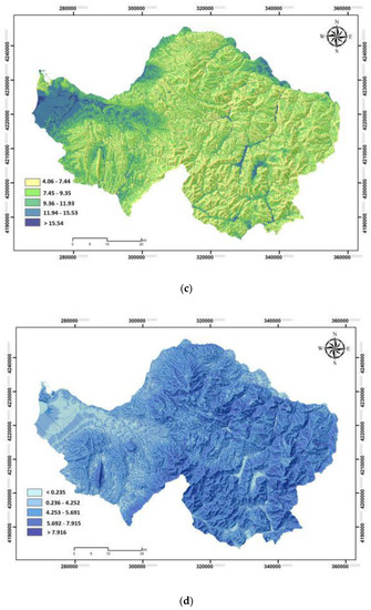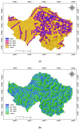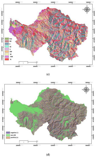 The geo-morphological parameters of elevation, slope angle, slope aspect, plan curvature, profile curvature, curvature, TWI, and SPI were derived using specific geo-processing tools found in the ArcGIS suite from an ASTER GDEM with 30 m resolution [63,84,90]. The lithological cover, hydrological cover, distance from faults, and distance from river network were digitized from the geological and topographic map sheets from IGME and National Topographic Maps that covered the area [91,92]. It is well known that elevation, slope angle, and slope aspect are three geo-morphological parameters that have a significant impact on landslides [93,94] (Figure 5a–c). It also well observed that areas of high altitude and smooth surface are less prone to landslide than abrupt slopes [95,96]. In the present study, elevation was classified into 5 classes, using the natural break classification scheme, whereas slope angles were classified into 5 classes based on expert knowledge. Slope aspect was classified into 8 classes, namely: north (N), northeast (NE), east (E), southeast (SE), south (S), southwest (SW), west (W), northwest (NW). Curvature, profile curvatures, plan curvatures, and secondary geo-morphological parameters are also considered as significant parameters, since they express local surface relief and complexities, which in most cases has an impact on the erosion process and landslides [93,97] (Figure 5d, Figure 6a,b). In the present study, the three curvature parameters were classified into three categories that represent negative, near zero, and positive values. According to Nefeslioglu et al. [38,98], the SPI parameter expresses the erosive power of surface flow and also the capability of sediment transportation, both processes influencing the landslide manifestation, with high values being evidence for increased erosion risk (Figure 6d) [99]. The TWI parameter can provide the spatial distribution of saturated source areas of runoff generation [100,101] based on the topography of the area (Figure 6c). SPI and TWI values were classified into 5 classes using the natural break method. As already mentioned, seismo-tectonic activity plays an important role in the manifestation of landslides [59,88]. In the present study, the distance from faults was classified into five classes: <150 m, 151–300 m, 301–450 m, 451–600 m, and > 601 m (Figure 7a). The spatial distribution of the river network influences the surface runoff and degree of ground water infiltration, which are processes that may create the appropriate conditions to cause landslides [102]. The distance from the river network was classified into five classes: <200 m, 201–400 m, 401–600 m, 601–800 m, and >801 m (Figure 7b). Finally, the hydrological cover was classified into three categories, namely: permeable formations, semi-permeable formations, and impermeable formations (Figure 7c).