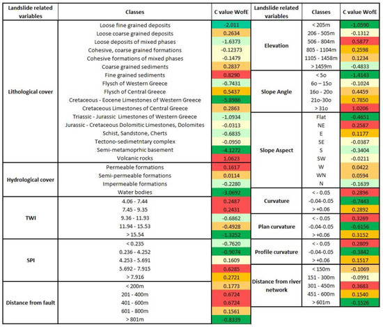 A strong influence also has been recorded for the parameter distance from fault (C = 0.6724), and classes that characterize areas between 201 and 600 m away from faults. A similar influence has been observed for the 4th class (C = 0.6285) of the SPI parameter, whereas areas with elevations between 506 and 804 m exhibit the high values of C (0.5877).