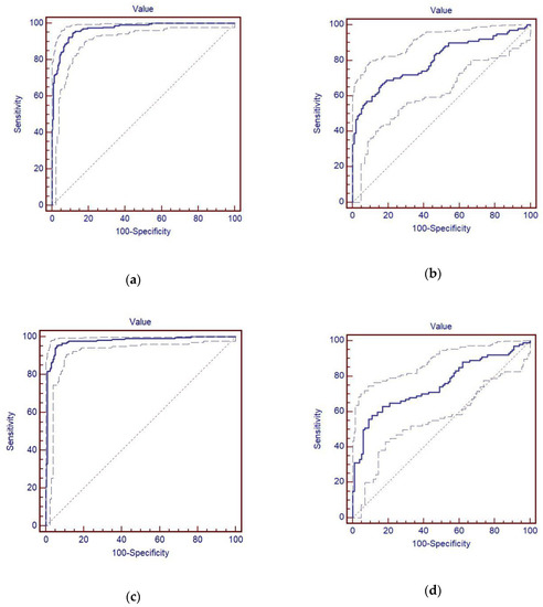 Receiver operating characteristic (ROC) analysis and ROC curves for the: (a) ANN model based on the training subset; (b) ANN model based on the test subset; (c) SVM model based on the training subset; (d) SVM model based on the test subset.