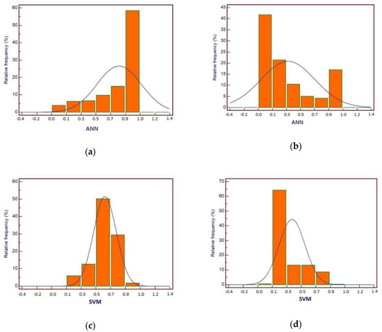 Figure 12a–d illustrates four histograms with the relative frequency and normal distribution that correspond to the two models and for landslide and non-landslide areas based on the testing dataset. The best ability to identify potential landslides was attributed to the ANN model, with almost 60% having values over 0.9. On the other hand, SVM gave the best results in the case of non-landslide areas. Slightly higher than 60% of the cases were lower than 0.3, indicating non-landslide areas, whereas the ANN model classified about 18% of non-landslide as landslides.