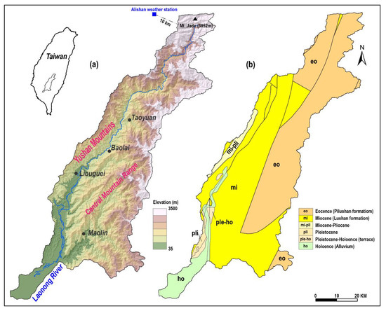 Location of the Laonong River watershed in Taiwan. (a) Color-shaded map of 20 m digital elevation model. (b) The geological map of the study area.
