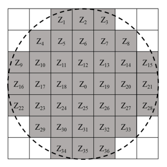 - Topographic roughness (unit: meters): The degree of topographic change in the area. Topographic roughness is calculated by using ArcGIS 10.7, with the standard deviation of the elevation values in a circular window (3 × 3 pixel, moving window) as a measure of the degree of elevation variation in the area [39]. A schematic diagram of the circular window is shown in Figure 2, and the standard deviation (SD) is calculated as follows:where SDh is the topographic roughness, nc is the number of points within the window, Zi is the elevation value of each point, and is the mean value of the elevation of each point within the window.