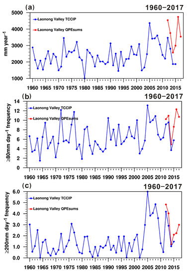 According to the long-term changes in annual rainfall of TCCIP from 1960 to 2017 (Figure 3a), after 2000, annual rainfall exhibited an increasing trend, peaking between 2005 and 2009. The long-term changes in the frequency of heavy rain (Figure 3b) had interannual fluctuations, yet the frequency did not greatly increase or decrease. The frequency was only slightly higher during the periods of 1971–1978 and 2005–2009. For the long-term changes in the frequency of extremely heavy rain (Figure 3c), it can be seen that the frequency after 2004 was significantly higher than that in the previous 40 years, which may be related to the number of typhoons. After 2000, the path tracking of typhoons in the northwest Pacific Ocean generally shifted northward, causing significantly more typhoons to invade Taiwan [51]. Moreover, the probability of extremely heavy rainfall events related to typhoons has also increased greatly [52]. Compared with the increase of annual rainfall after 2004 and the frequency change of heavy rain, it shows that the increase of annual rainfall is closely related to the occurrence frequency of heavy rain, that is, the main contribution of the increased annual rainfall comes from the form of heavy rainfall. Besides, the TCCIP and QPE sums exhibit significant differences in annual rainfall (Figure 3a) but are corresponding in the events of daily rainfall up to 80 and 200 mm (Figure 3b,c). This underestimation of TCCIP in annual rainfall resulted from the relatively few rainfall stations and missed some local precipitation in the mountainous areas.
