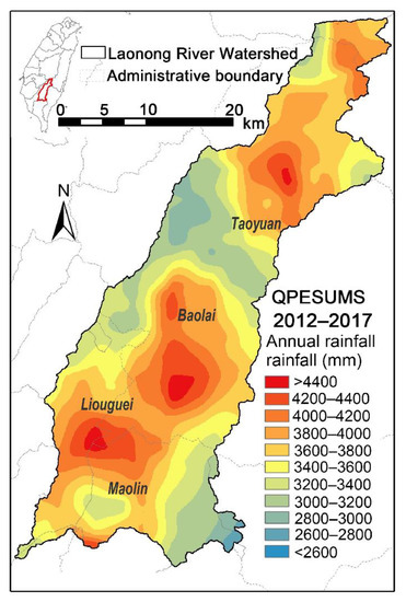 The changes in the long-term rainfall frequency and the spatial distribution of rainfall in the research area were analyzed based on the QPESUMS data from 2012 to 2017 (Figure 5). It can be seen that the rainfall is concentrated in two hot spots. The southern rainfall center lies at the junction of the Liouguei District and Maolin District in Kaohsiung City and extends northward to the southern part of the Taoyuan District, while the northern rainfall center is in the northern part of Taoyuan District, located in the upstream valley of the Laonong River. The southern rainfall center is larger than the northern center in both the area coverage and the rainfall amount.