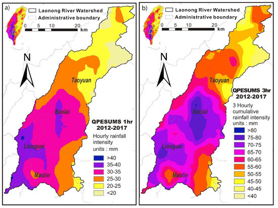 Spatial distribution of the top 1% of rainfall intensity in the Laonong River watershed: (a) hourly rainfall and (b) 3 h accumulated rainfall.
