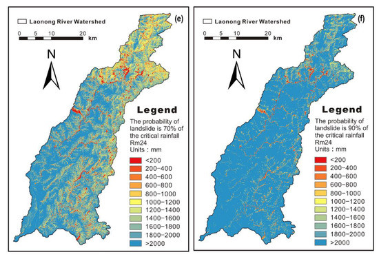 Simulation results of landslide probability due to rainfall and critical rainfall derived from the mixed model. (a) rainfall of 300 mm, (b) rainfall of 600 mm, (c) rainfall of 900 mm, (d) landslide probability of 50%, (e) landslide probability of 70%, (f) landslide probability of 90%.