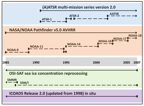 Figure 1. Timeline of availability of observational datasets for the Operational Sea Surface Temperature and Sea Ice Analysis (OSTIA) reanalysis (after Figure 1 in [8]). They include the (Advanced) Along-Track Scanning Radiometer ((A)ATSR) multi-mission series (blue shading), NASA/NOAA Pathfinder (orange shading), Ocean and Sea Ice Satellite Application Facility (OSI-SAF) sea ice concentration (green shading), and internal comprehensive Ocean Atmosphere Data Set (ICOADS) Release 2.0 in situ data (purple shading). - The NOAA Geo-Polar SST product is an operational NRT SST product, developed and delivered by NOAA [4]. The Geo-Polar SST product combines SST from a combination of two, and more recently three, polar orbiting satellites and now five geostationary satellites. The NRT Geo-Polar SST now uses NRT OSTIA as a bias correction reference, rather than the NOAA National Centers for Environmental Prediction (NCEP) Real-Time Global High-Resolution SST. As with OSTIA, the NRT Geo-Polar SST product is a daily, gap-free SST product, gridded at 0.05 degrees;