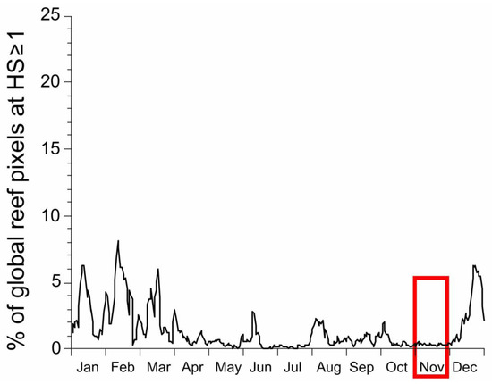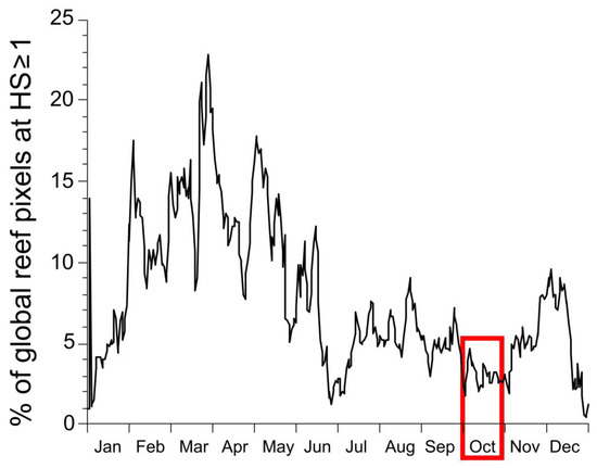 Percentage of global coral reef pixels at HotSpot (HS) ≥ 1 for 2002. Note that the red box represents the transition period from OSTIA reanalysis to the Geo-Polar sea surface temperature (SST) reanalysis, which took place from 1 to 28 November 2002.