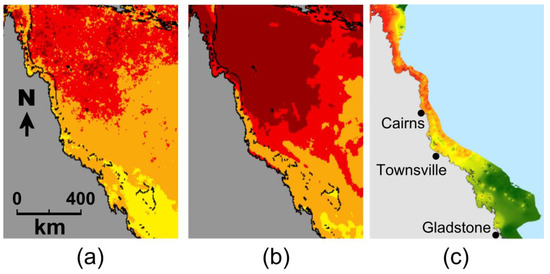 Comparison between Bleaching Alert Area (BAA) for the 2016 bleaching event on the Great Barrier Reef (BAA version 2.0 (a) and BAA version 3.1 (b)) and bleaching observations (c). BAA data were obtained from the NOAA Coral Reef Watch website (www.coralreefwatch.noaa.gov). The BAA categories are: yellow (Watch ≡ 0 < HS < 1), orange (Warning ≡ 0 < DHW < 4), light red (Alert Level 1 ≡ 4 ≤ DHW < 8) and dark red (Alert Level 2 ≡ DHW ≥ 8). Bleaching observations were obtained via extensive aerial surveys (totalling 1156 reefs): dark green (<1% of corals bleached), light green (1–10%), yellow (10–30%), orange (30–60%), red (>60%) (from [26]).