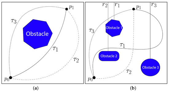 Considering the topological nature of the posed path planning problem, it is important to explain the notion of homotopy in that context and describe the way we will be using it. In essence, two paths that start and finish in the same configuration are considered to be homotopic to each other if they can be continuously deformed into each other without crossing any obstacles. Two homotopic paths are said to be in the same homotopy class, which is represented by a unique invariant called h-signature [17]. Examples of homotopic and non-homotopic paths are shown in Figure 2a—paths and are homotopic to each other and therefore have the same h-signature, i.e., , where h is a function that computes the homotopy class of a given path. In Figure 2a, path cannot be deformed into without crossing the obstacle, indicating that they are not homotopic and, therefore, do not belong to same homotopy class, i.e., . In the context of path planning for tethered robots, homotopy is an important concept. If, for example, a robot equipped with a retractile tether anchored in follows the path of Figure 2a, its tether would assume a shape that is homotopic to . The taut tether would have the same shape if the robot follows , which is also homotopic to , as we concluded earlier. Therefore, by constraining the path of the robot to have a specific homotopy class, we can constrain the tether to have the same class. The idea of this paper is to plan robot paths that make the tether to be homotopic to the shortest possible path from the anchor position to the goal. Since the shortest path, by definition, does not circulate any obstacles, the tether will also not circulate an obstacle, thus guaranteeing a tangle-free motion.