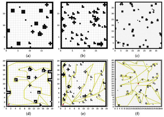 Typical randomized environments used in simulations. Shown are typical configurations for low-density environment (a), high-density environment (b) and large environment (c), as well as example paths taken to explore them, shown in (d–f), respectively.