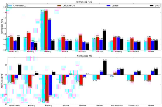 Figure 2 shows the normalised MAE and MB from the point-based comparison of the gridded datasets to the individual stations. In terms of the satellite datasets, GSMaP performed the best, followed by CMORPH BLD and then CMORPH CRT with the average normalised MAE of the nine stations analysed being 0.44, 0.49, and 0.62 respectively.