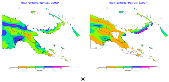 To investigate the performance of the satellite-derived estimates across the two often distinct seasons in PNG, the dataset was split into a wet and a dry season based on the time of the year. Even though seasonality varies with geographical location as discussed in Section 2.1, the West Pacific Monsoon is the main seasonal driver for most of PNG and thus was used as the basis of this analysis. Consequently, the months from November to April were classified as wet while those from May to October were classified dry. Figure 5 illustrates the seasonal mean rainfall as estimated by GSMaP and ERA5. GSMaP data was chosen due to its slightly better performance over the other datasets.