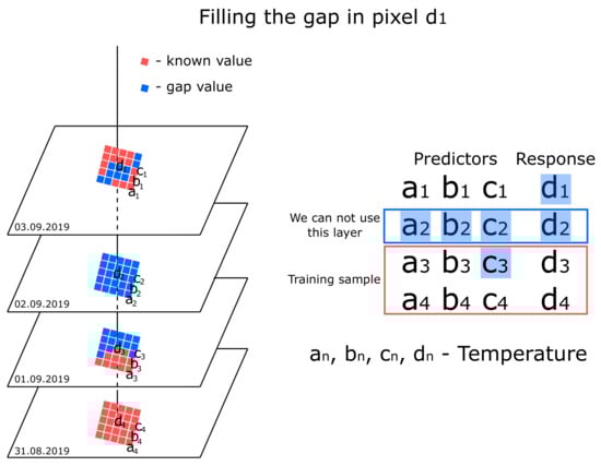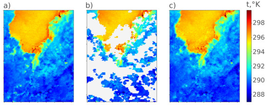 One of the most widely required geophysical parameters derived with remote sensing techniques is land surface temperature (LST), which is crucial for ecological [5], hydrological [6], meteorological [7], geological [8] and other kinds of environmental research. The problem of filling in gaps in LST data is widely covered in the literature [9,10,11]. Thermal remote sensing is sensitive to cloud conditions, and for many regions with undesirable climate conditions, most of LST data is missed. At the same time, LST is an environmental variable with relatively stable behavior and understandable genesis, and usually we can determine patterns in its’ spatial and temporal distribution [12]. In other words, we can assume that, based on LST values in the surrounding areas, according to previously observed spatial relationships, it is possible to retrieve valid LST for missing places.