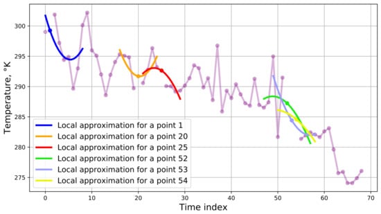 If the image was completely covered by the cloud, it is not possible to restore the values using the described approach. In this case, time series construction is used to fill in the gaps. In other words, images are placed on a regular time series grid. The sampling procedure can be performed with any time step size. The resulting gaps in the time series are restored using a locally median value or using a local approximation by a n degree polynomial constructed from k known neighboring points, where n is the given degree of the polynomial, and k is the number of points adjacent to the gap that the coefficients of the polynomial function are estimated from. In the example, n is equal to 2 and k is equal to 5 (Figure 3).