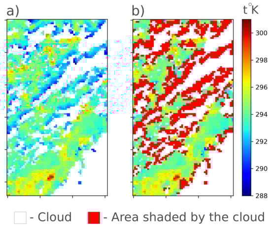 If the specific task of the gap filling is to get images that characterize the average temperature distribution in the absence of clouds, rather than at the specific time, then it is appropriate to use an approach to exclude pixels shaded by clouds. A cellular automaton [56] can be applied to detect such shaded pixels. This block of the algorithm is optional, and the user could decide to use it as an additional mechanism to filter data or not. A probabilistic approach is used to determine shaded pixels. The probability of assigning a pixel to a shaded one is proportional to the number of neighboring (Moore’s neighborhood [56]) pixels covered by the cloud. The probability of assigning a pixel to a shaded one is greater for those pixels whose temperature is lower than the median temperature value for pixels from the same biome or land cover type. The result of the algorithm is shown in Figure 4.